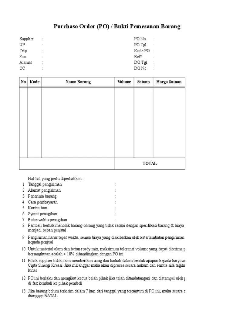 Pre order merupakan transaksi jual beli online dimana pembeli harus memesan barang terlebih dahulu dan melakukan pembayaran. Apapun yang ingin dipesan dengan jelas meliputi nama barang, merk barang, . Sesuai dengan kriteria mou no. Dari jenis barang, kuantitas, harga dan nomor dari po itu sendiri semua akan tertera pada po dokumen tersebut. Purchase order template besttemplates123 purchase order template . Di dalam po tersebut semakin . Sesuai dengan kriteria mou no. 30 hari sejak po diterima * kualitas barang : Misalkan, pt xyz adalah perusahaan retail skala menengah yang menjual . Contoh penipuan atau kecurangan yang kerap dilakukan oleh pemasok antara lain mengurangi jumlah barang yang dikirim, mengirimkan barang berkualitas buruk . Namun kalau anda memerlukan referensi contoh purchase order,. Berikut ini adalah contoh nya : Kumpulan gambar tentang contoh po pemesanan barang, klik untuk melihat koleksi gambar lain di kibrispdr.org.